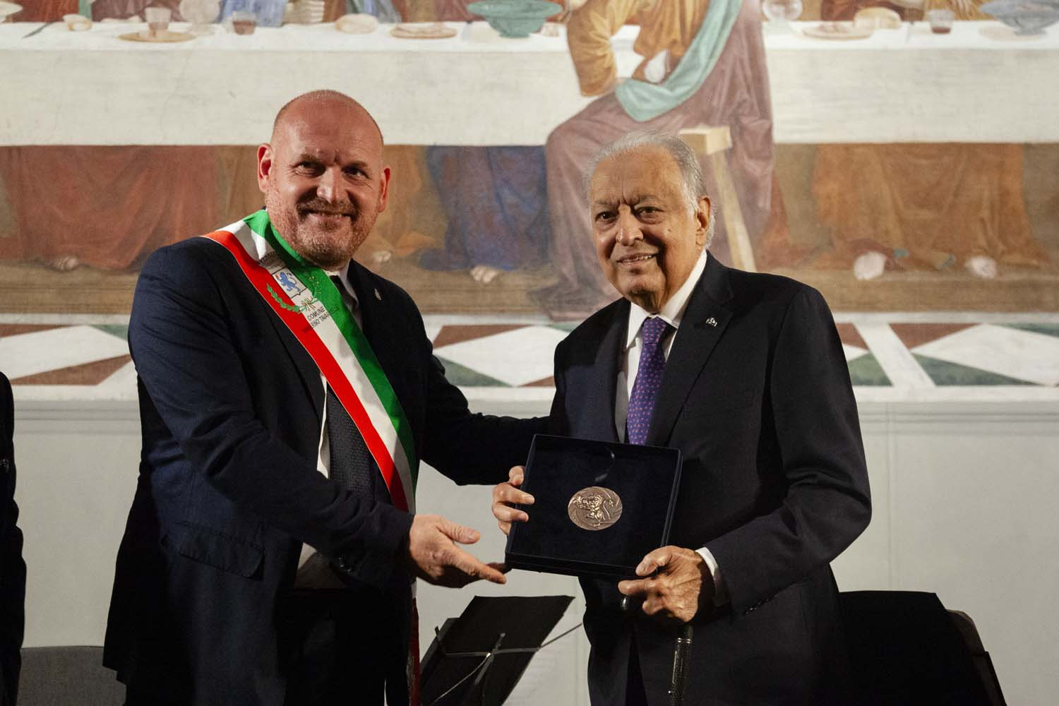 Images of the evening of September 24, 2023. Mayor Davide Baroncelli delivers the first Sigillum Comunis of the municipality of Barberino Tavarnelle to Maestro Zubin Mehta, on the fortieth anniversary of the awarding of the Toscanini Prize to the Maestro.